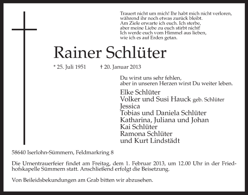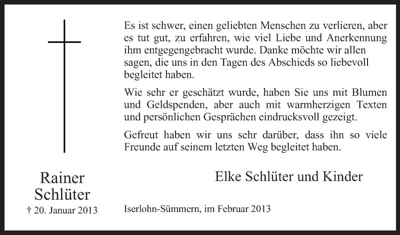 Hier finden Sie alle Traueranzeigen aus der Zeitung, die bisher für Rainer Schlüter erschienen sind. Weitere Traueranzeigen, die in der Zeitung erscheinen, werden hier ebenfalls aufgelistet