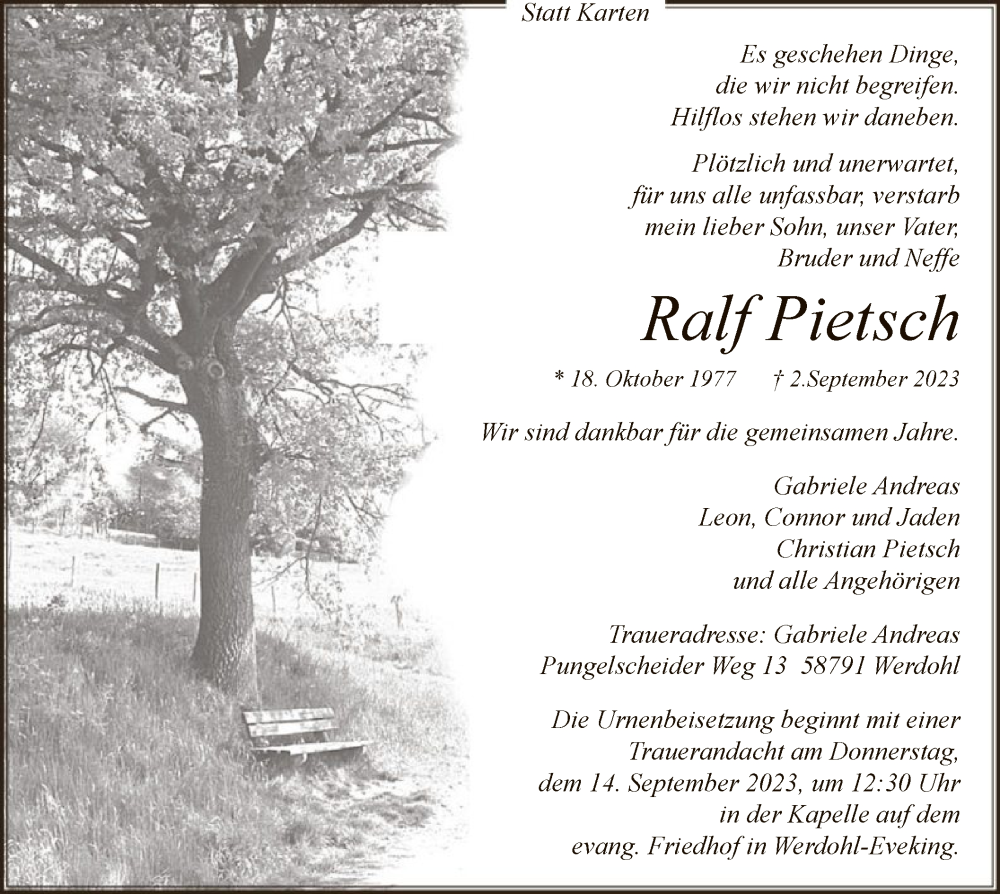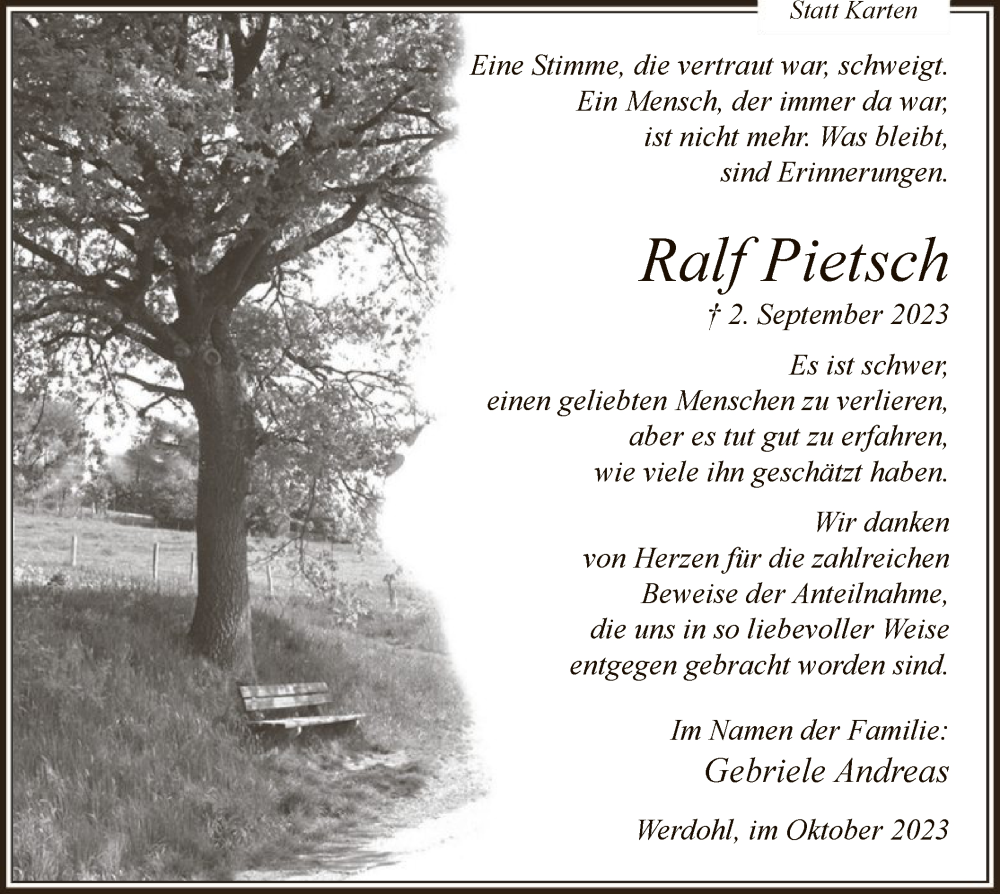 Hier finden Sie alle Traueranzeigen aus der Zeitung, die bisher für Ralf Pietsch erschienen sind. Weitere Traueranzeigen, die in der Zeitung erscheinen, werden hier ebenfalls aufgelistet