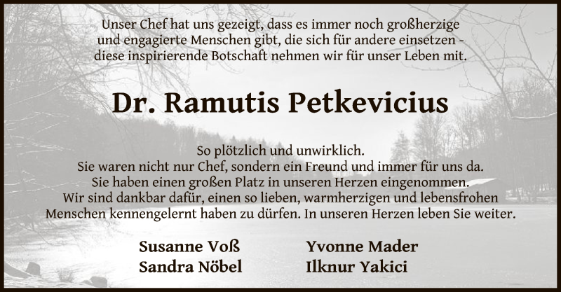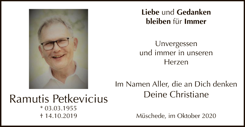 Hier finden Sie alle Traueranzeigen aus der Zeitung, die bisher für Ramutis Petkevicius erschienen sind. Weitere Traueranzeigen, die in der Zeitung erscheinen, werden hier ebenfalls aufgelistet