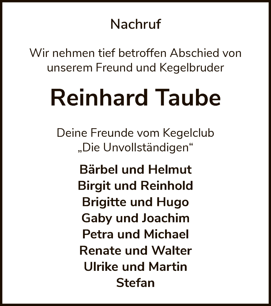 Hier finden Sie alle Traueranzeigen aus der Zeitung, die bisher für Reinhard Taube erschienen sind. Weitere Traueranzeigen, die in der Zeitung erscheinen, werden hier ebenfalls aufgelistet