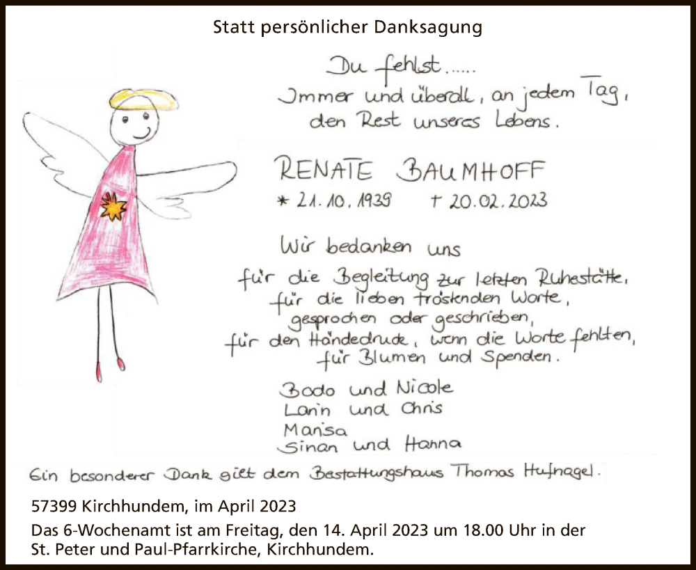 Hier finden Sie alle Traueranzeigen aus der Zeitung, die bisher für Renate Baumhoff erschienen sind. Weitere Traueranzeigen, die in der Zeitung erscheinen, werden hier ebenfalls aufgelistet