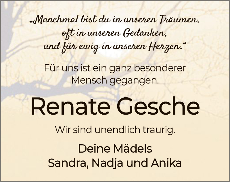 Hier finden Sie alle Traueranzeigen aus der Zeitung, die bisher für Renate Gesche erschienen sind. Weitere Traueranzeigen, die in der Zeitung erscheinen, werden hier ebenfalls aufgelistet