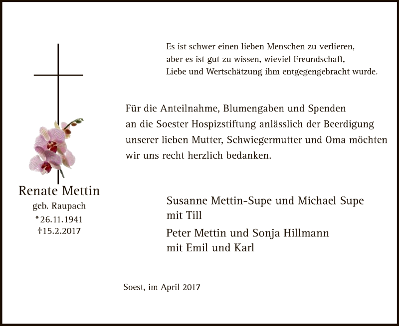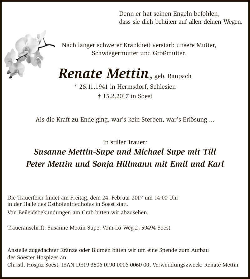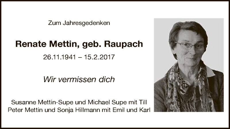 Hier finden Sie alle Traueranzeigen aus der Zeitung, die bisher für Renate Mettin erschienen sind. Weitere Traueranzeigen, die in der Zeitung erscheinen, werden hier ebenfalls aufgelistet