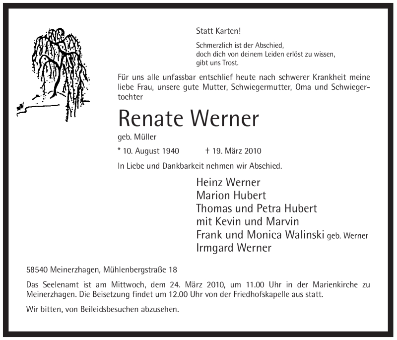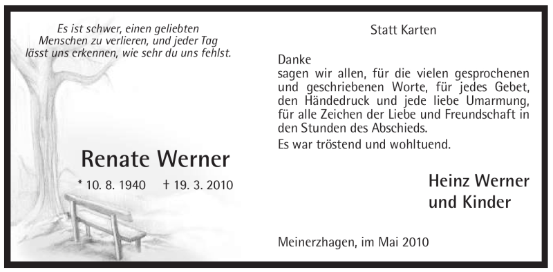 Hier finden Sie alle Traueranzeigen aus der Zeitung, die bisher für Renate Werner erschienen sind. Weitere Traueranzeigen, die in der Zeitung erscheinen, werden hier ebenfalls aufgelistet