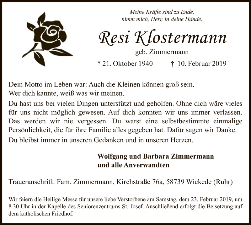 Hier finden Sie alle Traueranzeigen aus der Zeitung, die bisher für Resi Klostermann erschienen sind. Weitere Traueranzeigen, die in der Zeitung erscheinen, werden hier ebenfalls aufgelistet
