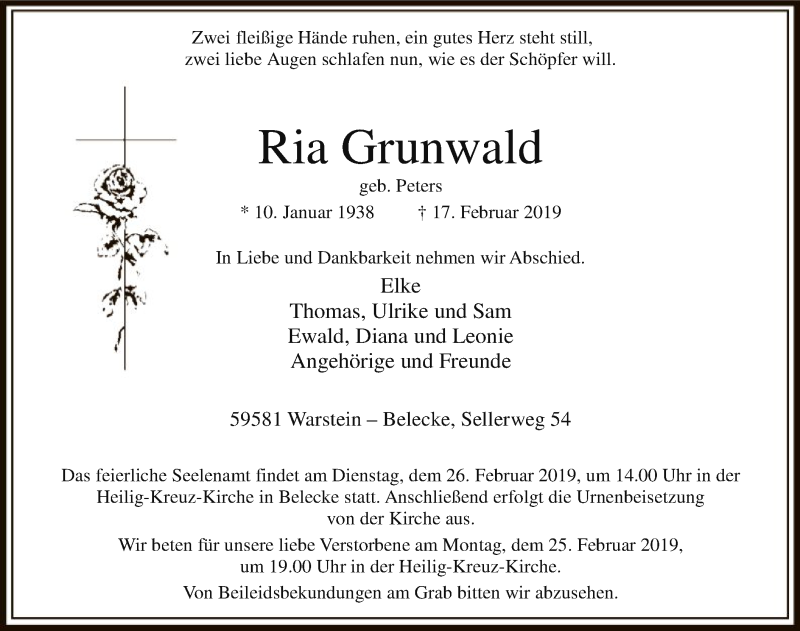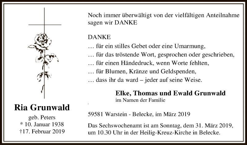 Hier finden Sie alle Traueranzeigen aus der Zeitung, die bisher für Ria Grunwald erschienen sind. Weitere Traueranzeigen, die in der Zeitung erscheinen, werden hier ebenfalls aufgelistet