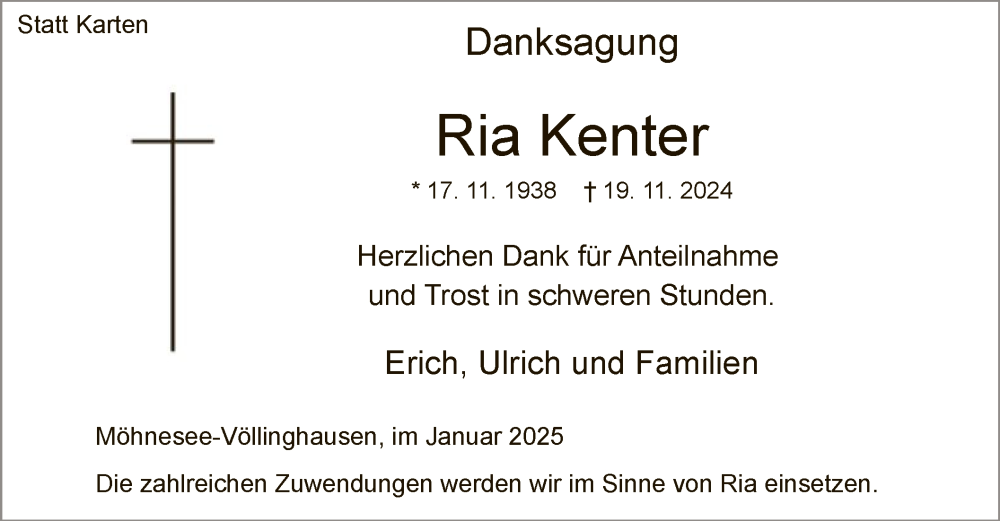 Hier finden Sie alle Traueranzeigen aus der Zeitung, die bisher für Ria Kenter erschienen sind. Weitere Traueranzeigen, die in der Zeitung erscheinen, werden hier ebenfalls aufgelistet