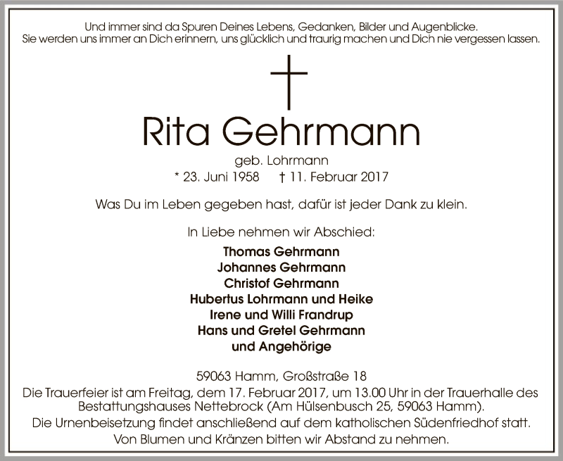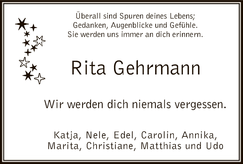 Hier finden Sie alle Traueranzeigen aus der Zeitung, die bisher für Rita Gehrmann erschienen sind. Weitere Traueranzeigen, die in der Zeitung erscheinen, werden hier ebenfalls aufgelistet