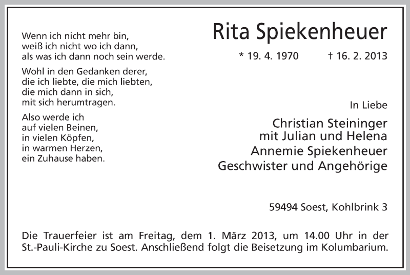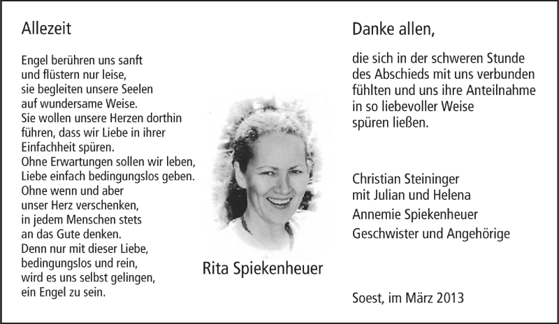 Hier finden Sie alle Traueranzeigen aus der Zeitung, die bisher für Rita Spiekenheuer erschienen sind. Weitere Traueranzeigen, die in der Zeitung erscheinen, werden hier ebenfalls aufgelistet