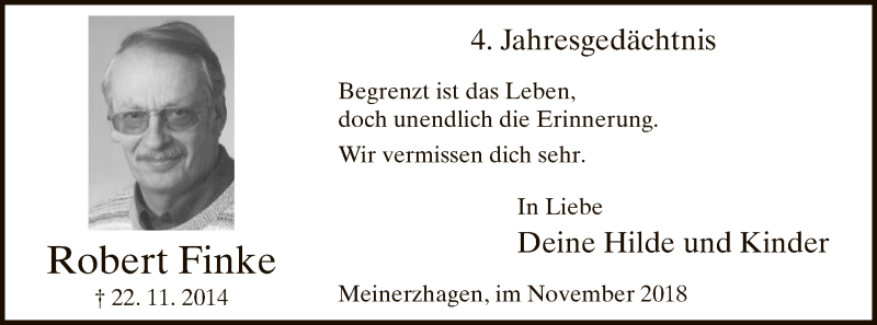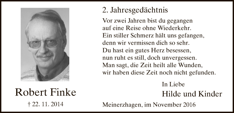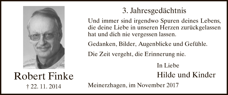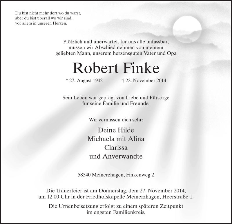 Hier finden Sie alle Traueranzeigen aus der Zeitung, die bisher für Robert Finke erschienen sind. Weitere Traueranzeigen, die in der Zeitung erscheinen, werden hier ebenfalls aufgelistet