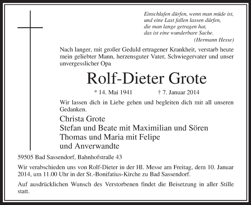 Hier finden Sie alle Traueranzeigen aus der Zeitung, die bisher für Rolf-Dieter Grote erschienen sind. Weitere Traueranzeigen, die in der Zeitung erscheinen, werden hier ebenfalls aufgelistet