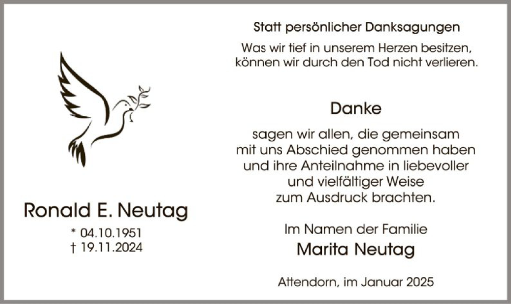 Hier finden Sie alle Traueranzeigen aus der Zeitung, die bisher für Ronald E. Neutag erschienen sind. Weitere Traueranzeigen, die in der Zeitung erscheinen, werden hier ebenfalls aufgelistet