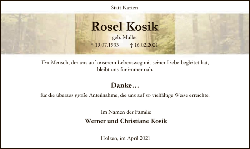 Hier finden Sie alle Traueranzeigen aus der Zeitung, die bisher für Rosel Kosik erschienen sind. Weitere Traueranzeigen, die in der Zeitung erscheinen, werden hier ebenfalls aufgelistet