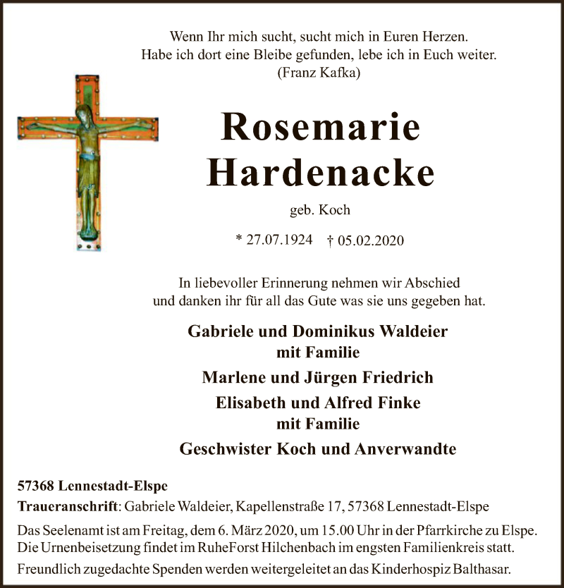 Hier finden Sie alle Traueranzeigen aus der Zeitung, die bisher für Rosemarie Hardenacke erschienen sind. Weitere Traueranzeigen, die in der Zeitung erscheinen, werden hier ebenfalls aufgelistet