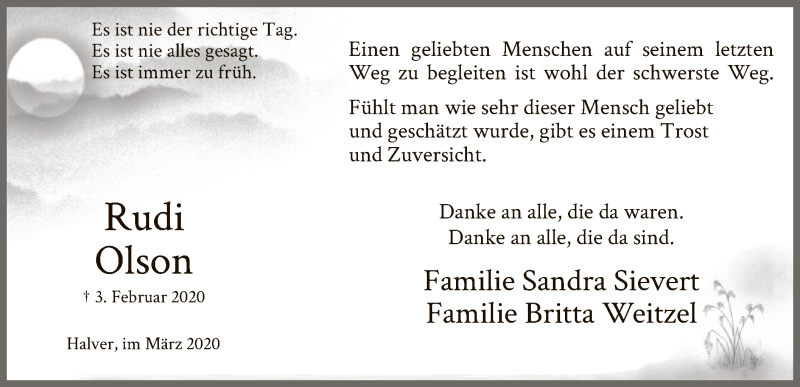 Hier finden Sie alle Traueranzeigen aus der Zeitung, die bisher für Rudi Olson erschienen sind. Weitere Traueranzeigen, die in der Zeitung erscheinen, werden hier ebenfalls aufgelistet