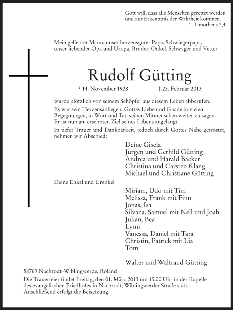 Hier finden Sie alle Traueranzeigen aus der Zeitung, die bisher für Rudolf Gütting erschienen sind. Weitere Traueranzeigen, die in der Zeitung erscheinen, werden hier ebenfalls aufgelistet