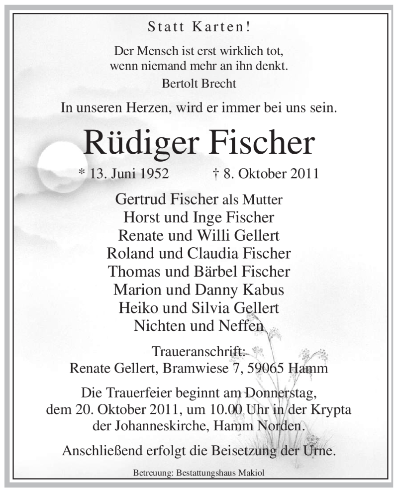 Hier finden Sie alle Traueranzeigen aus der Zeitung, die bisher für Rüdiger Fischer erschienen sind. Weitere Traueranzeigen, die in der Zeitung erscheinen, werden hier ebenfalls aufgelistet