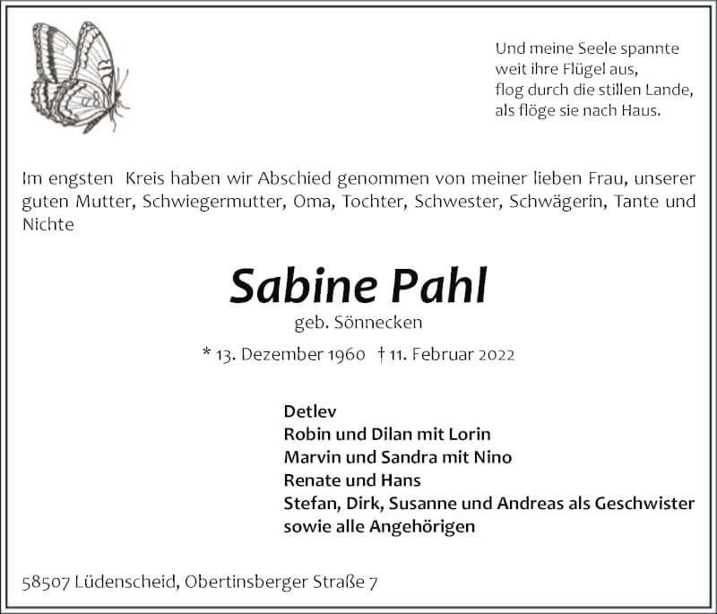 Hier finden Sie alle Traueranzeigen aus der Zeitung, die bisher für Sabine Pahl erschienen sind. Weitere Traueranzeigen, die in der Zeitung erscheinen, werden hier ebenfalls aufgelistet