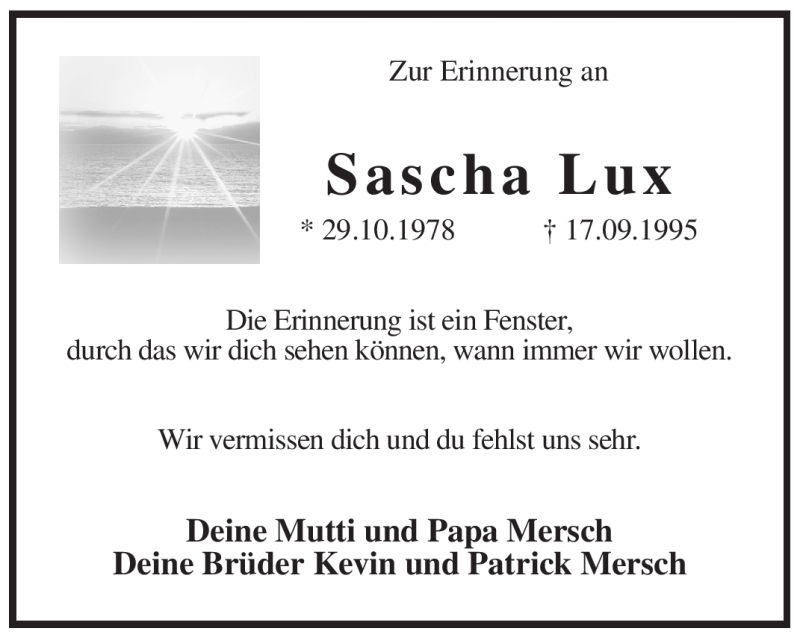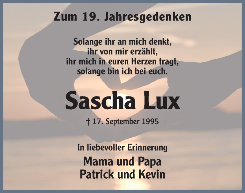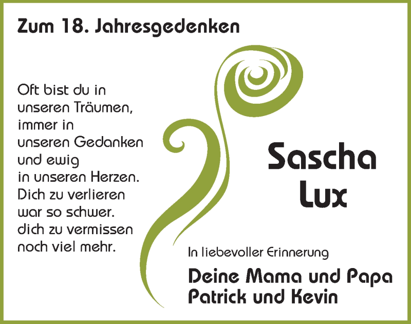 Hier finden Sie alle Traueranzeigen aus der Zeitung, die bisher für Sascha Lux erschienen sind. Weitere Traueranzeigen, die in der Zeitung erscheinen, werden hier ebenfalls aufgelistet