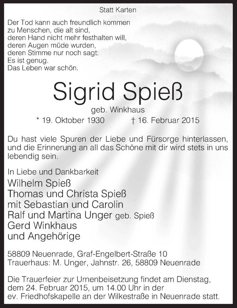 Hier finden Sie alle Traueranzeigen aus der Zeitung, die bisher für Sigrid Spieß erschienen sind. Weitere Traueranzeigen, die in der Zeitung erscheinen, werden hier ebenfalls aufgelistet