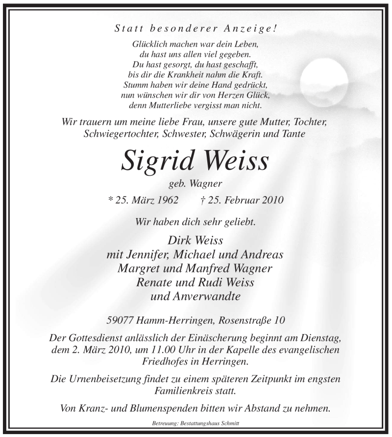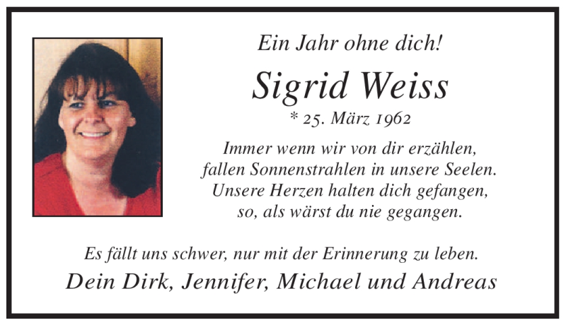 Hier finden Sie alle Traueranzeigen aus der Zeitung, die bisher für Sigrid Weiss erschienen sind. Weitere Traueranzeigen, die in der Zeitung erscheinen, werden hier ebenfalls aufgelistet