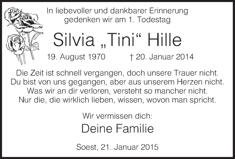 Hier finden Sie alle Traueranzeigen aus der Zeitung, die bisher für Silvia Hille erschienen sind. Weitere Traueranzeigen, die in der Zeitung erscheinen, werden hier ebenfalls aufgelistet