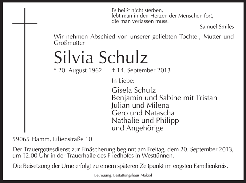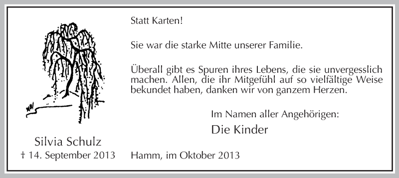 Hier finden Sie alle Traueranzeigen aus der Zeitung, die bisher für Silvia Schulz erschienen sind. Weitere Traueranzeigen, die in der Zeitung erscheinen, werden hier ebenfalls aufgelistet