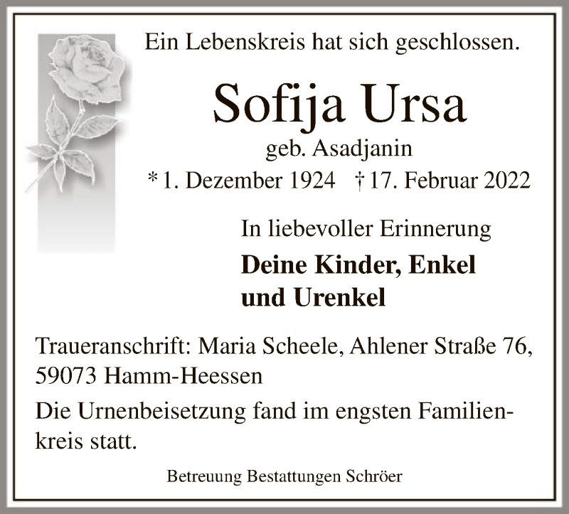 Hier finden Sie alle Traueranzeigen aus der Zeitung, die bisher für Sofija Ursa erschienen sind. Weitere Traueranzeigen, die in der Zeitung erscheinen, werden hier ebenfalls aufgelistet