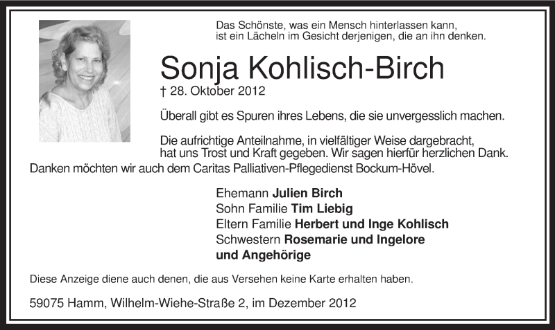 Hier finden Sie alle Traueranzeigen aus der Zeitung, die bisher für Sonja Kohlisch-Birch erschienen sind. Weitere Traueranzeigen, die in der Zeitung erscheinen, werden hier ebenfalls aufgelistet