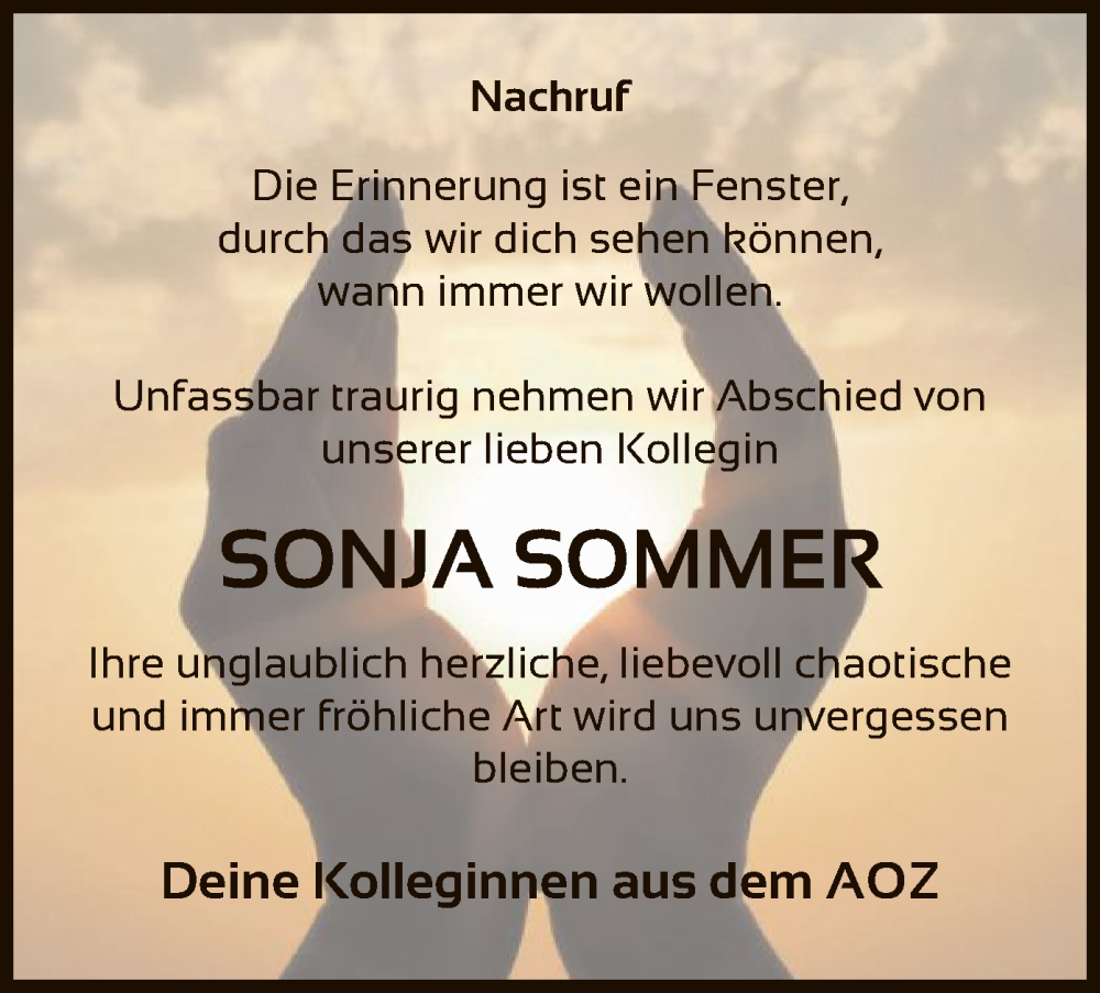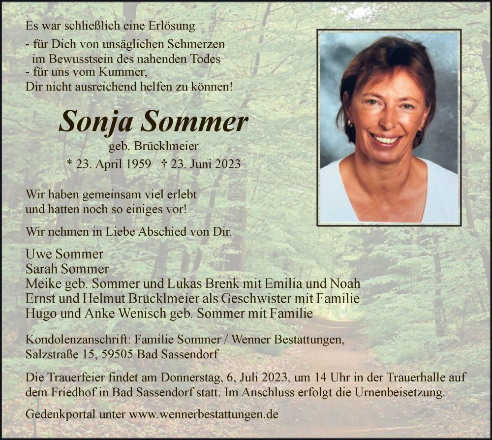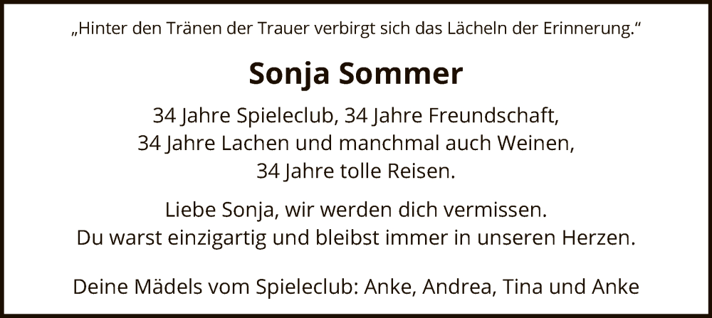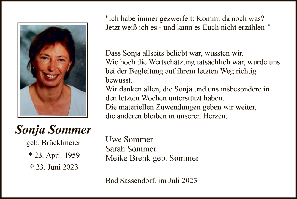 Hier finden Sie alle Traueranzeigen aus der Zeitung, die bisher für Sonja Sommer erschienen sind. Weitere Traueranzeigen, die in der Zeitung erscheinen, werden hier ebenfalls aufgelistet