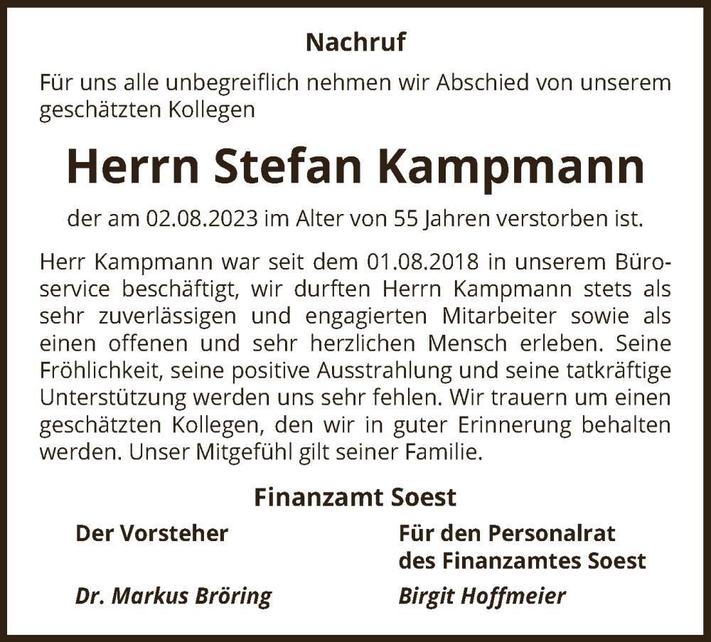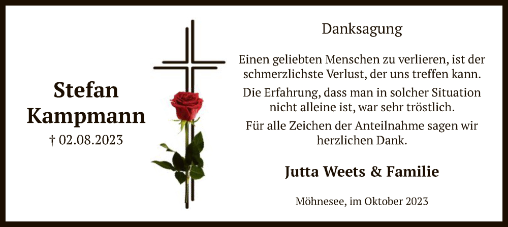 Hier finden Sie alle Traueranzeigen aus der Zeitung, die bisher für Stefan Kampmann erschienen sind. Weitere Traueranzeigen, die in der Zeitung erscheinen, werden hier ebenfalls aufgelistet