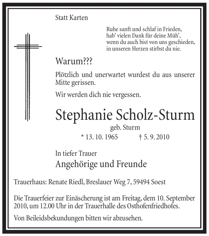 Hier finden Sie alle Traueranzeigen aus der Zeitung, die bisher für Stephanie Scholz-Sturm erschienen sind. Weitere Traueranzeigen, die in der Zeitung erscheinen, werden hier ebenfalls aufgelistet