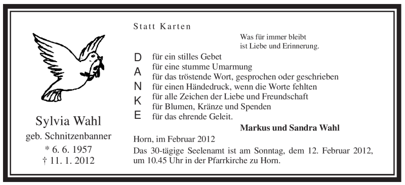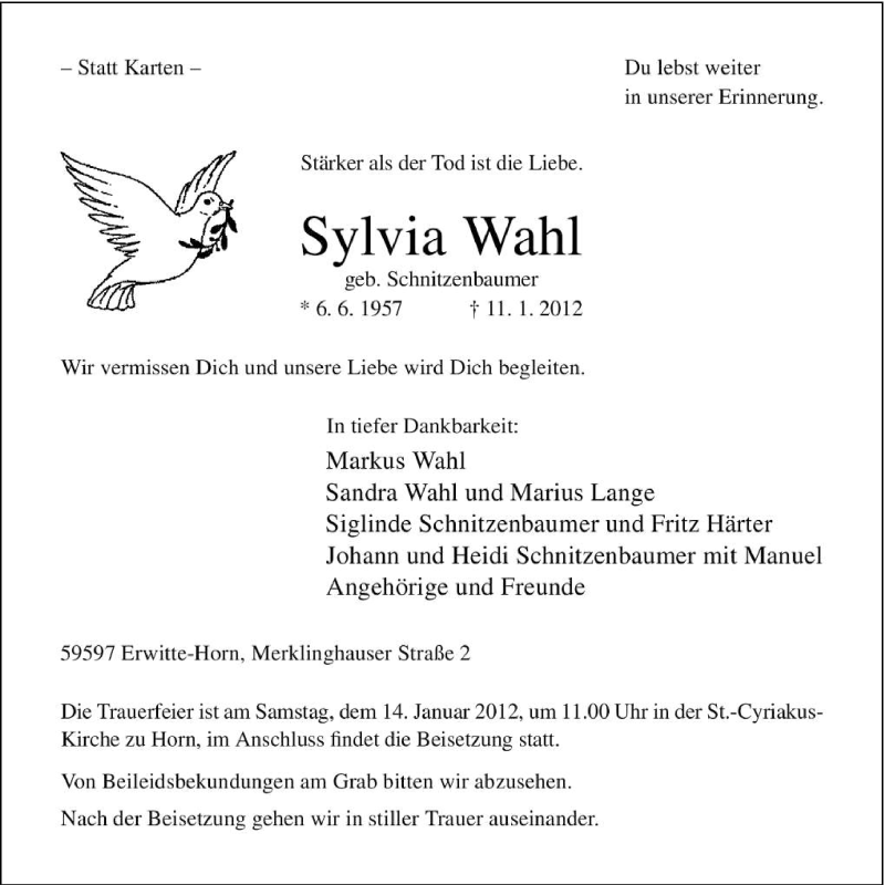 Hier finden Sie alle Traueranzeigen aus der Zeitung, die bisher für Sylvia Wahl erschienen sind. Weitere Traueranzeigen, die in der Zeitung erscheinen, werden hier ebenfalls aufgelistet