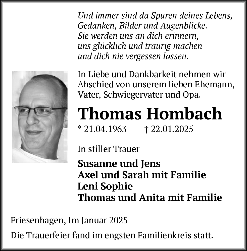Hier finden Sie alle Traueranzeigen aus der Zeitung, die bisher für Thomas Hombach erschienen sind. Weitere Traueranzeigen, die in der Zeitung erscheinen, werden hier ebenfalls aufgelistet