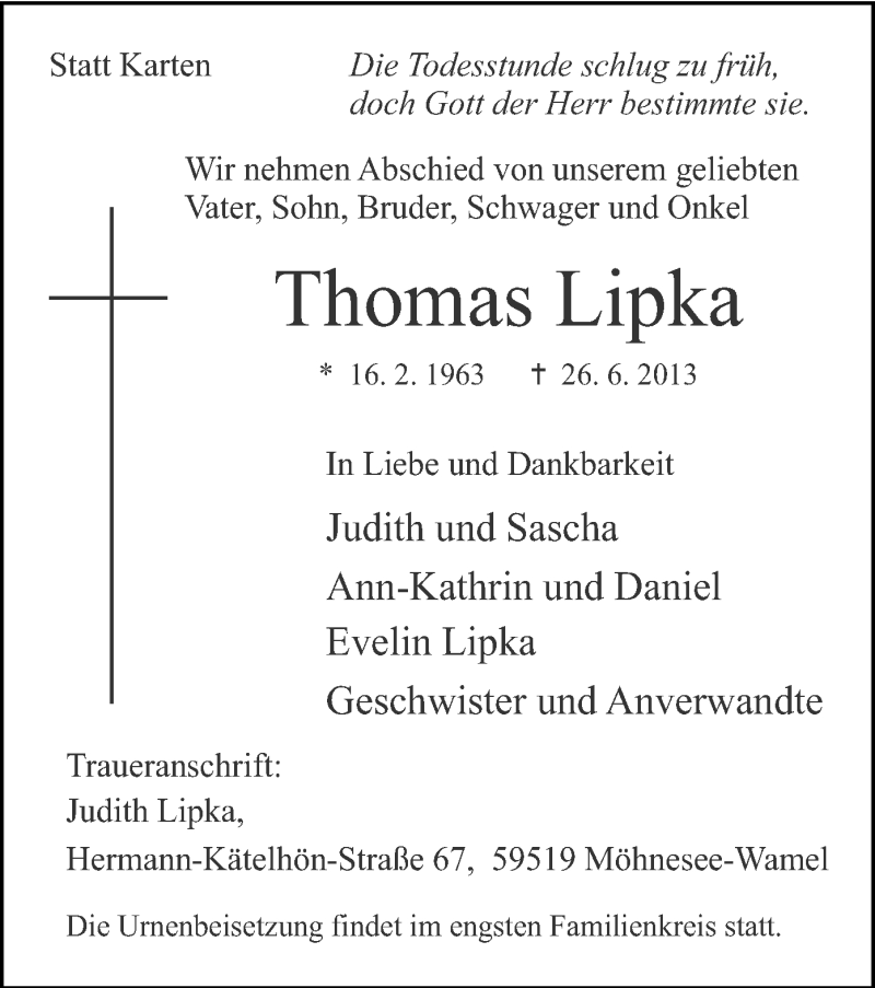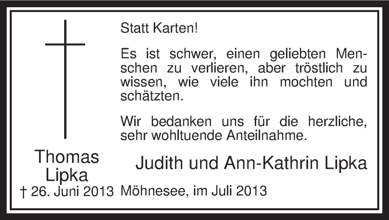 Hier finden Sie alle Traueranzeigen aus der Zeitung, die bisher für Thomas Lipka erschienen sind. Weitere Traueranzeigen, die in der Zeitung erscheinen, werden hier ebenfalls aufgelistet