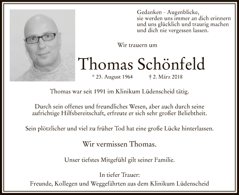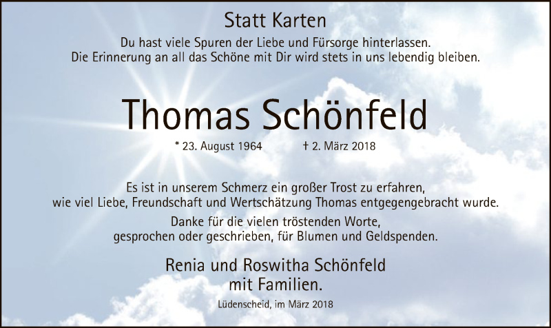 Hier finden Sie alle Traueranzeigen aus der Zeitung, die bisher für Thomas Schönfeld erschienen sind. Weitere Traueranzeigen, die in der Zeitung erscheinen, werden hier ebenfalls aufgelistet