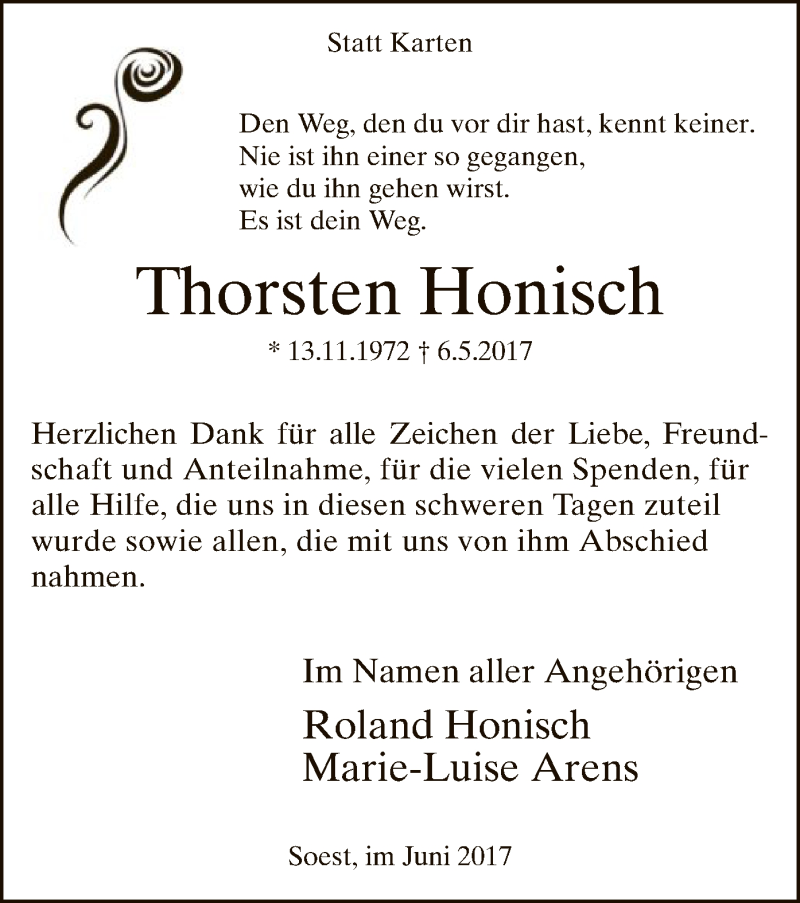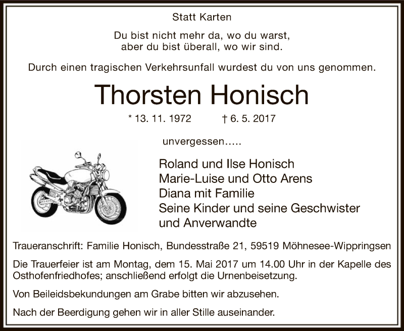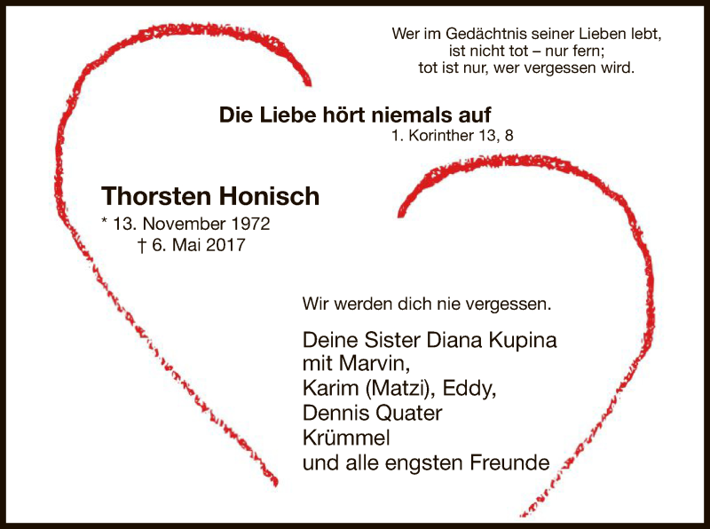 Hier finden Sie alle Traueranzeigen aus der Zeitung, die bisher für Thorsten Honisch erschienen sind. Weitere Traueranzeigen, die in der Zeitung erscheinen, werden hier ebenfalls aufgelistet