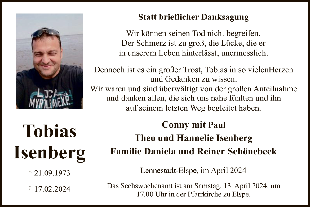 Hier finden Sie alle Traueranzeigen aus der Zeitung, die bisher für Tobias Isenberg erschienen sind. Weitere Traueranzeigen, die in der Zeitung erscheinen, werden hier ebenfalls aufgelistet
