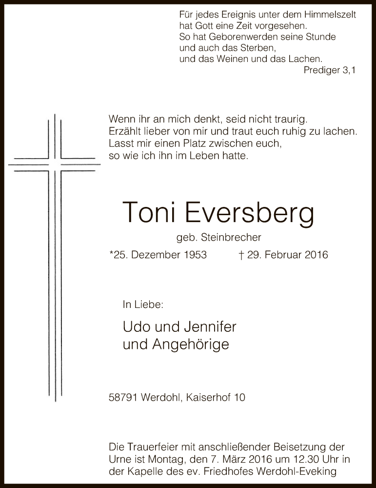 Hier finden Sie alle Traueranzeigen aus der Zeitung, die bisher für Toni Eversberg erschienen sind. Weitere Traueranzeigen, die in der Zeitung erscheinen, werden hier ebenfalls aufgelistet