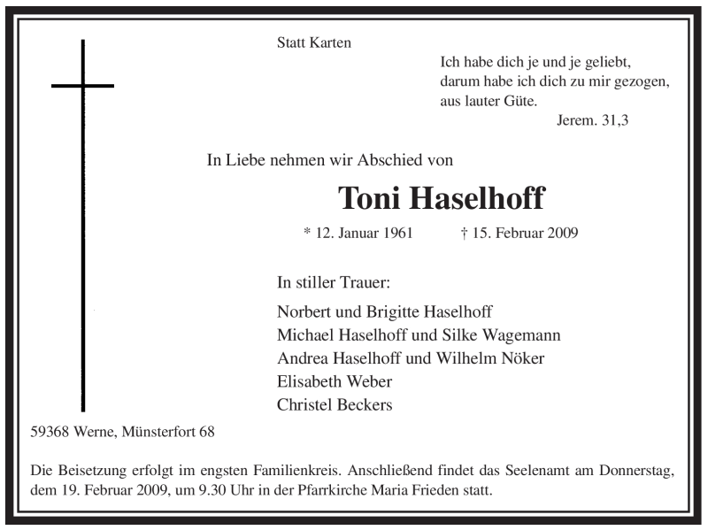 Hier finden Sie alle Traueranzeigen aus der Zeitung, die bisher für Toni Haselhoff erschienen sind. Weitere Traueranzeigen, die in der Zeitung erscheinen, werden hier ebenfalls aufgelistet