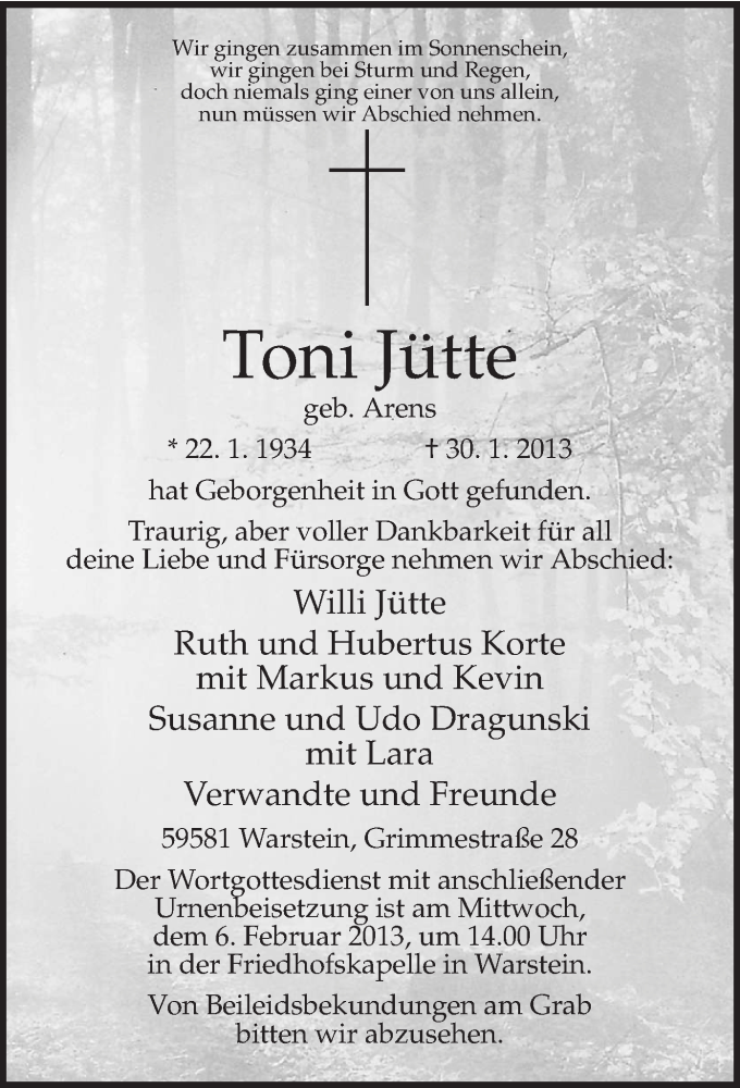 Hier finden Sie alle Traueranzeigen aus der Zeitung, die bisher für Toni Jütte erschienen sind. Weitere Traueranzeigen, die in der Zeitung erscheinen, werden hier ebenfalls aufgelistet
