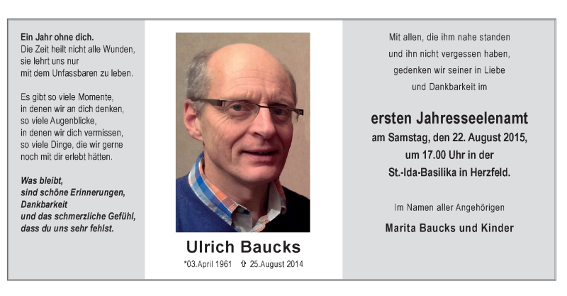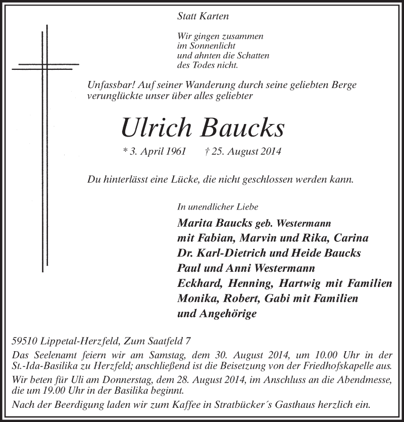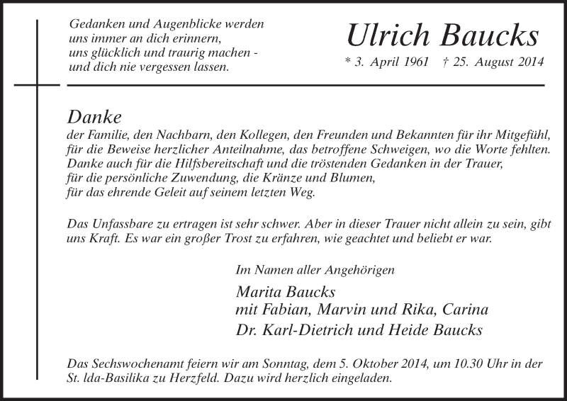 Hier finden Sie alle Traueranzeigen aus der Zeitung, die bisher für Ulrich Baucks erschienen sind. Weitere Traueranzeigen, die in der Zeitung erscheinen, werden hier ebenfalls aufgelistet
