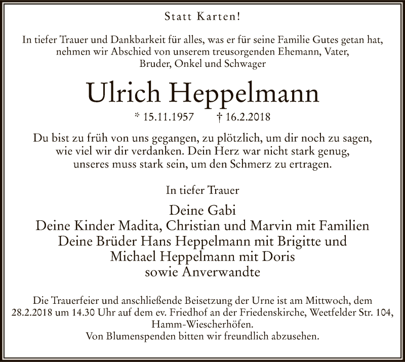 Hier finden Sie alle Traueranzeigen aus der Zeitung, die bisher für Ulrich Heppelmann erschienen sind. Weitere Traueranzeigen, die in der Zeitung erscheinen, werden hier ebenfalls aufgelistet