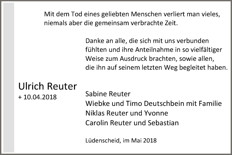 Hier finden Sie alle Traueranzeigen aus der Zeitung, die bisher für Ulrich Reuter erschienen sind. Weitere Traueranzeigen, die in der Zeitung erscheinen, werden hier ebenfalls aufgelistet