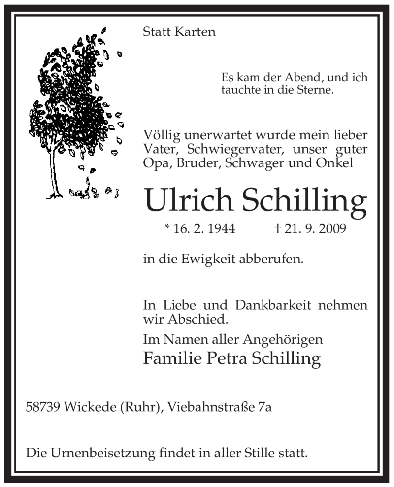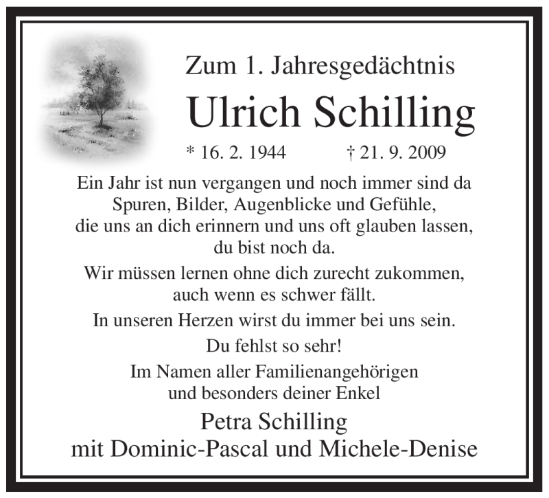Hier finden Sie alle Traueranzeigen aus der Zeitung, die bisher für Ulrich Schilling erschienen sind. Weitere Traueranzeigen, die in der Zeitung erscheinen, werden hier ebenfalls aufgelistet