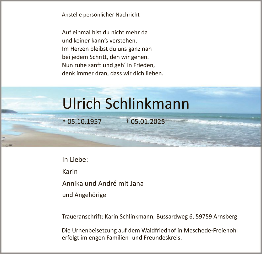 Hier finden Sie alle Traueranzeigen aus der Zeitung, die bisher für Ulrich Schlinkmann erschienen sind. Weitere Traueranzeigen, die in der Zeitung erscheinen, werden hier ebenfalls aufgelistet
