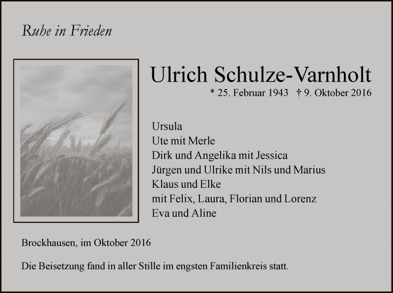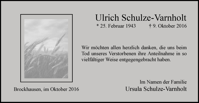 Hier finden Sie alle Traueranzeigen aus der Zeitung, die bisher für Ulrich Schulze-Varnholt erschienen sind. Weitere Traueranzeigen, die in der Zeitung erscheinen, werden hier ebenfalls aufgelistet