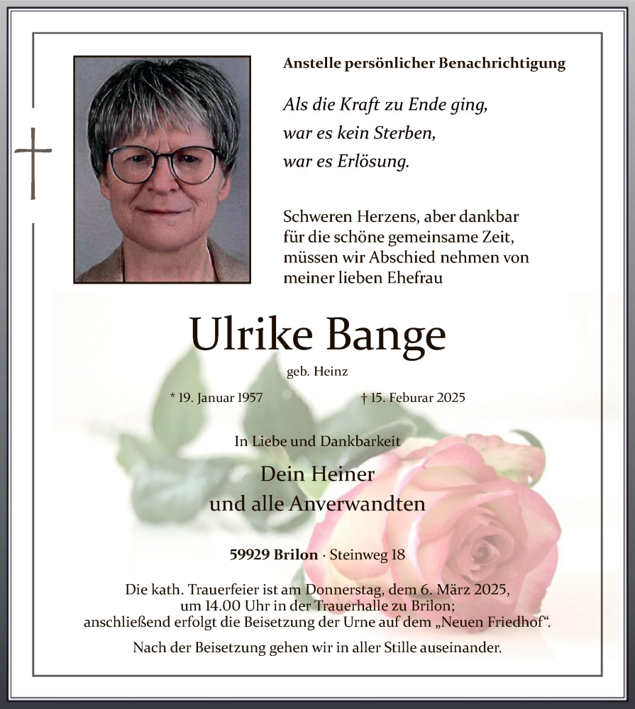 Hier finden Sie alle Traueranzeigen aus der Zeitung, die bisher für Ulrike Bange erschienen sind. Weitere Traueranzeigen, die in der Zeitung erscheinen, werden hier ebenfalls aufgelistet