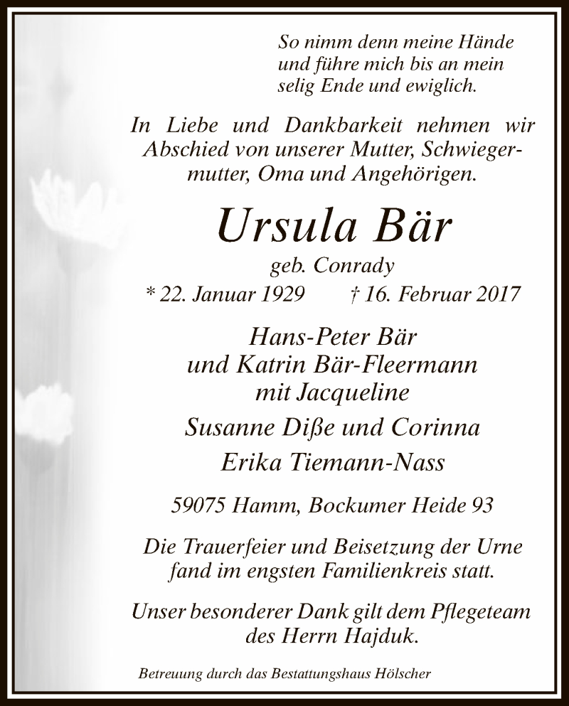 Hier finden Sie alle Traueranzeigen aus der Zeitung, die bisher für Ursula Bär erschienen sind. Weitere Traueranzeigen, die in der Zeitung erscheinen, werden hier ebenfalls aufgelistet