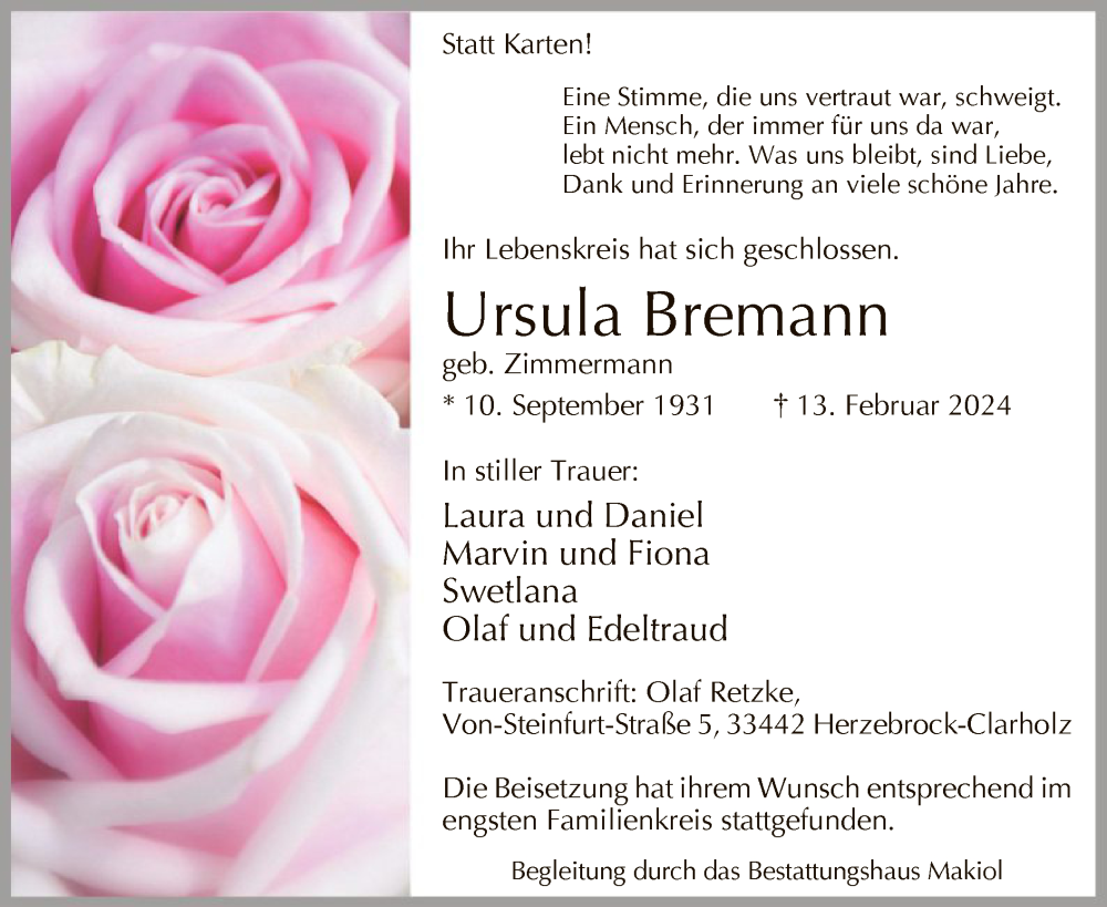 Hier finden Sie alle Traueranzeigen aus der Zeitung, die bisher für Ursula Bremann erschienen sind. Weitere Traueranzeigen, die in der Zeitung erscheinen, werden hier ebenfalls aufgelistet